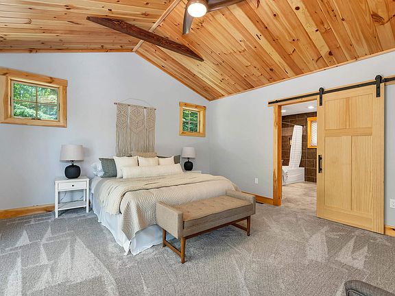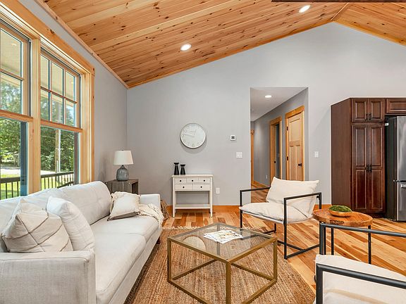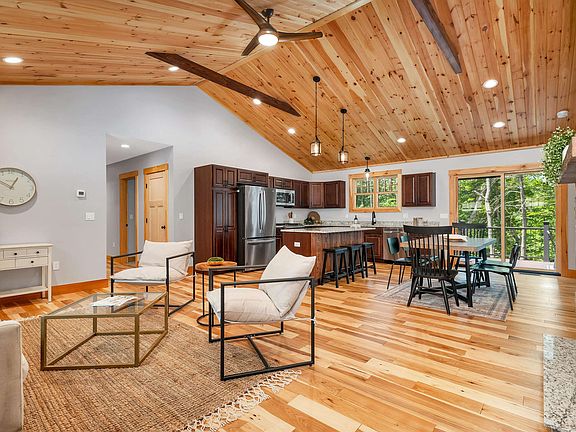 Gilford, NH - Luxury 4-bedroom, 3-bathroom home features multiple entertaining rooms so there is space to share. Entering through the front door brings you into the main entertaining space with the kitchen, the dining room, and the upper-level living area showcasing a Connecticut Fieldstone Gas Fireplace. The main level also holds the primary bedroom with an ensuite bath and laundry and a second bedroom or office next to the mudroom or sports equipment room. The main level is completed with the second bathroom, which is easily accessible to the entertainment space. The lower level is a walkout with a second living room, additional bedrooms on either side, and a sauna, bathroom, and laundry. The lower-level walkout has been wired for a Hot tub on the patio. The builder also wired the home for a generator. The home's exterior has low-maintenance vinyl siding and multiple rock retaining walls. Peekaboo mountain views, beach rights (Gilford beach), and easy access to Gunstock Mountain and the Lakes Region’s year-round activities round out this wonderful home.