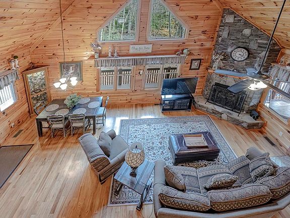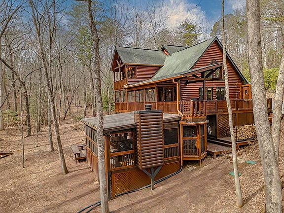 Welcome to “Our Blue Heaven”!!  This Mountain Tops community home is far from ordinary, with unmatched outdoor living and entertaining space. Offering the convenience of living about five minutes from downtown Blue Ridge, offering all paved roads, a level parking area, and an adjacent 25'x25' heavy timber carport. An inviting home filled with warmth and character. Elegance and style are present throughout this three-bedroom, three-full-bathroom cabin. Great room design with a stacked stone corner fireplace and cathedral ceilings with large windows fill the space with an abundance of natural light. Modern kitchen with large center island, granite counters, upgraded cabinets, and stainless steel appliances. The oversized upstairs owner suite features a vaulted ceiling, a Juliet-style balcony, a separate mini split, a large walk-in closet, dual vanity, and a tiled shower. The finished terrace level offers additional guest quarters, a family room w/gas fireplace, a full-sized pool table, and access to the lower 800+ sq ft screen in a covered party deck featuring a wood-burning fireplace, a five-person hot tub, and an abundance of seating options. This covered deck gives you a front-row seat to your private wooded backyard with daily visitors such as deer and wild turkey. This property has a very gentle slope and is very pet and kid-friendly. Most of the land is walkable and could easily be fenced in. If you can't enjoy the cabin full-time, no worries; it has a proven track record as a successful cabin rental. Being sold mostly furnished. Welcome home to 80 N. Hiawatha Trail!!