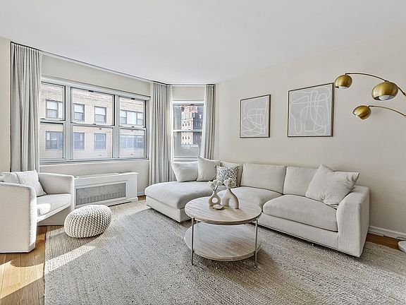 The ample living room (almost 27 feet long!), provides excellent flexibility with how to arrange the space, easily accommodating a large furniture set, separate dining table with additional room for a home office setup. The kitchen boasts all stainless steel appliances, clean white cabinets with plenty of storage and Caesarstone countertops. The bathroom remodel is anchored in cool, gray tones with marble accents. The gracious corner bedroom has direct South and West facing windows and excellent closet space.