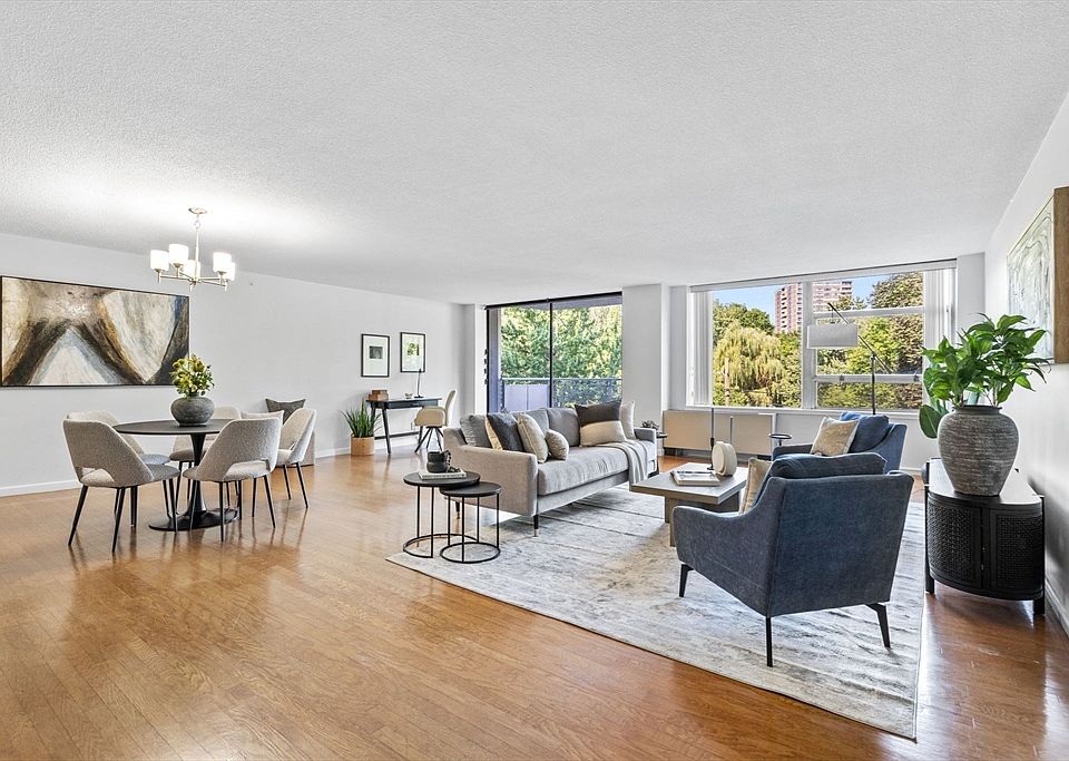 Step into this sun-drenched and expansive 2 bedroom, 2 bath that lives large thanks to an open-concept design and generous windows allowing light to pour in throughout the day. The living and dining areas flow seamlessly to a balcony offering serene park views, creating the perfect setting for entertaining or relaxed everyday living. Key features include a modern, well-proportioned kitchen visible from the main living area, a primary suite with a private bath and ample walk-in closet space, a second bedroom or office, and hardwood floors throughout, with a neutral palette ready for any decor. The private balcony offers outdoor seating and greenery-filled views, overlooking the magically peaceful Griggs Park. Conveniently located near Coolidge Corner, Washington Sq & Brookline Village, this home puts shops, dining, parks, public transit and the LMA all within minutes walk, drive or T ride. One assigned garage parking space and additional storage are included in the sale.
