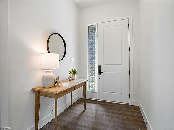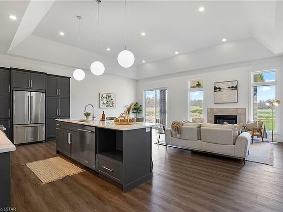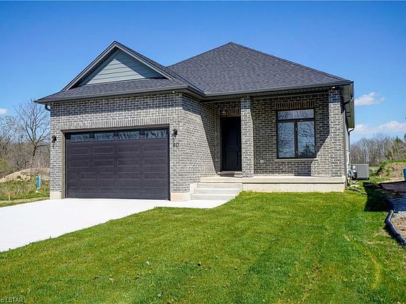 Welcome 80 Queen Street, nestled in the charming town of Ailsa Craig, Ontario. This recently constructed bungalow offers 2,046 square feet of living space, including the fully finished basement. The inviting foyer leads seamlessly to the open concept living room, kitchen and dinette area which features 12-foot tray ceilings, expansive windows filling the area with natural light and creating an inviting ambiance for gatherings and relaxation. In the Kitchen you will find high-end cabinets from Van Beek Kitchens, quartz countertops, and an oversized island, perfect for preparing meals and entertaining guests. Adjacent to the kitchen, the dinette offers direct access to the covered back deck, overlooking the large backyard. The main floor also features a spacious primary bedroom with a walk-in closet and ensuite highlighted with a tiled stand-up shower and double-sink vanity. Also on the main floor you'll find another bedroom, a full bathroom, and a laundry room. The finished basement features nine-foot ceilings and includes two more bedrooms, a full bathroom, and a large rec room, ideal for hosting family and friends. Additional features include: 10-foot ceilings, 8-foot interior door, central vac rough-in, gas stove, backsplash, and fruit cellar. This home is perfect for those looking for the peaceful small town living, with the convenience of being just 22 minutes to north London, 12 minutes to Lucan and 27 minutes to the picturesque shores of Lake Huron.