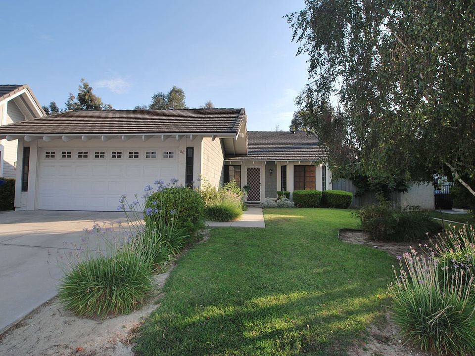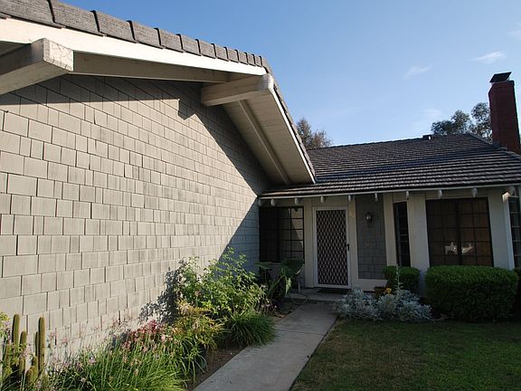 Charming one story view home! Backs to lushly landscaped slope with hills and views. No neighbors behind you for extra privacy. Nice flooring throughout. Vaultedceilings greet the entrance and living room. Living room is open to the kitchen with vaulted ceilings and track lighting along with rich wood plank flooring. Some windowsare newer dual paned. The master bedroom boasts a spacious walk in closet, linen cabinets, newer light maple laminate flooring, new custom vanity cabinets and granitecounter top. The yards are lush and green with automatic sprinklers front and rear. Enjoy peaceful views under your covered patio in back. Fruit trees in backyard:banana, fig, lemon, peach and grapes. Cool central air, gas stove, new dishwasher, and concrete tile roof. Schools