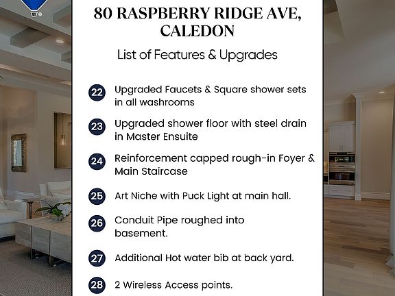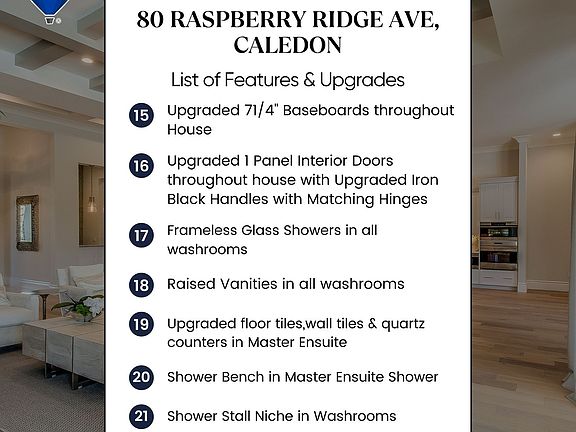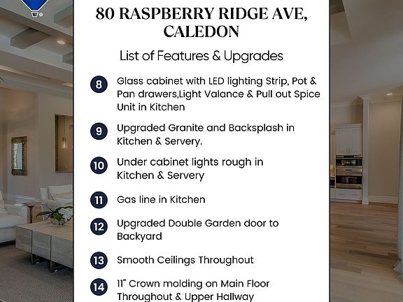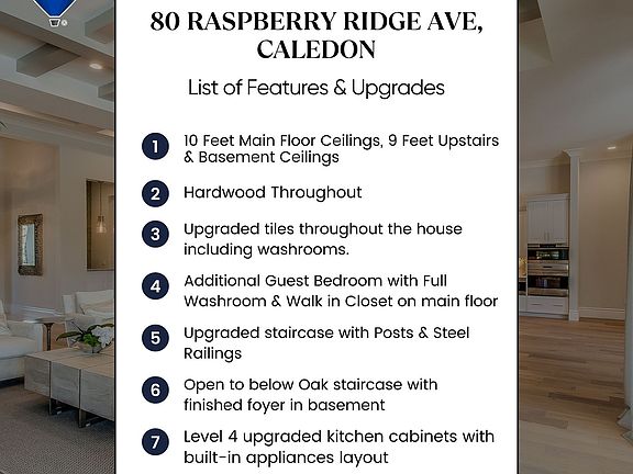 Lavish Luxury! Absolutely Stunning & Exquisitely Upgraded!! Brand New 50 Ft Detached Model In Caledon East Newest Community: Castles Of Caledon! The "Columbus" Model Features 5 Bedrooms & 5.5 Washrooms. Approx 4500 Sq Ft. Spacious Open Concept Layout With Grand Open To Above Family Room, Including: 10 Ft Ceilings on main & 9 & 9 On 2nd and Bsmt, Separate Entrance To Basement With another set of Open to below Upgraded Oak Service Stairs To Basement With Finished Landing Area. Upgraded staircase with Posts & Steel Railings. Hardwood Floor Throughout & Upgraded Porcelain Tiles, Smooth Ceilings Throughout. 11" Upgraded Crown Molding on Main Floor & Upper Hallway,71/4 Inch Baseboards, Level 4 upgraded kitchen cabinets with built-in appliances layout with Upgraded Countertops & Backsplash In Kitchen and Master Ensuite, Glass cabinet with LED lighting Strip, Pot & Pan drawers, Light Valance & Pull out Spice Unit in Kitchen. Under cabinet lights rough in Kitchen & Servery. Art Niche with Puck Light at main hall. Upgraded Garden Double door to Backyard! Upgraded 1 Panel Interior Doors throughout house with Upgraded Iron Black Handles with Matching Hinges This Model Also Has A Main Floor Guest Bedroom With Full Washroom & Walk In Closet Which Can Also Be Used As A Library And Many More Upgrades.**LIST OF UPGRADES ATTACHED** BRAND NEW JENN AIR BUILT IN KITCHEN APPLIANCES WITH GE CLOTHES WASHER DRYER HAS BEEN INSTALLED** **EXTRAS** Over 225K Spent On Upgrades from builder. Upgraded All Standing Glass Showers. Shower Bench and Shower Niche Master Ensuite. Raised Vanities & Upgraded Faucets & Square shower sets In Washrooms. Upgraded shower floor with steel drain in Master Ensuite