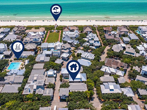 Discover the charm of Rosemary Beach in this enchanting cottage and carriage house. Perfectly situated on a desirable corner lot, this home provides easy access to the Eastern Green, the stunning turquoise blue water of the Gulf of Mexico, the refreshing Coquina Pool, tennis courts, and the vibrant town center brimming with shops and restaurants. Vacation renters rave about the fabulous location and the inviting atmosphere. Over $212K rental revenue 2023.The main cottage exudes a cozy, treehouse feel with its large wraparound upstairs porch, nestled amidst the trees. Inside, all three beautifully appointed bedrooms, each with its own ensuite bath, are located on the first floor, ensuring privacy and comfort. Ascend to the second floor to find a bright, airy living space where the