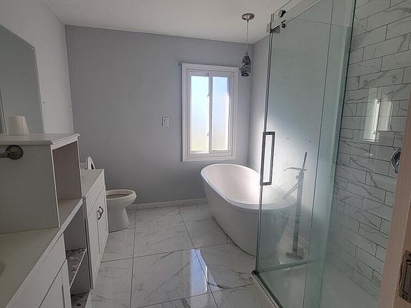 The eat-in kitchen is just steps away, ready for daily meals or gatherings, with plenty of space for a large dining table. Down the hall, the fully renovated bathroom is a showstopper—featuring elegant marble-look tile, a freestanding soaking tub, a glass-enclosed walk-in shower, and dual vanities that bring spa-quality luxury into your daily routine.