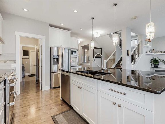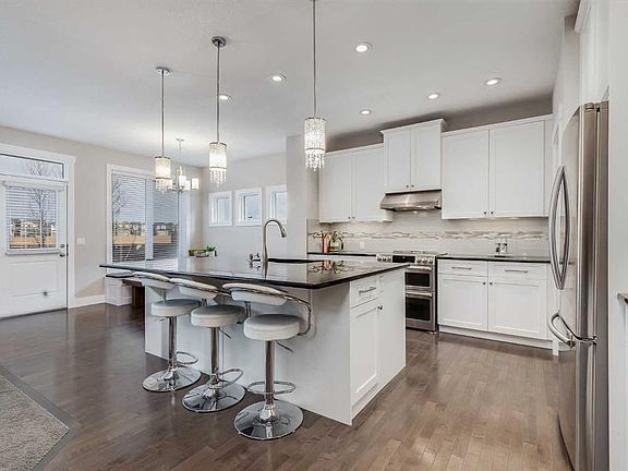 Welcome to 80 Evansfield Place NW — an exceptional 5-bedroom 3.5 bathroom family home offering over 3,330 sq. ft. of beautifully designed living space, perfectly situated in the heart of Evanston. Set on an expansive pie-shaped lot backing directly onto open green space and tucked away on a quiet cul-de-sac, this property delivers rare privacy, incredible yard space, and an ideal setting for a growing family. Step inside to a bright, open-concept main floor showcasing high ceilings, large windows, and a layout that flows seamlessly for everyday living and entertaining. The spacious kitchen features granite countertops, a large center island with breakfast bar, abundant cabinetry, stainless steel appliances, and a walkthrough pantry that connects directly to the mudroom for added convenience. A dedicated main-floor home office provides valuable flexibility for remote work or study. Upstairs, the thoughtful design continues with four generously sized bedrooms, including a serene primary retreat with a walk-in closet and spa-like ensuite, along with a versatile bonus room ideal for relaxation, play, or movie nights. A 5-piece bathroom completes the second level, offering both functionality and convenience for busy family living. The professionally finished basement expands the home’s versatility with an additional bedroom, two flexible-use rooms, and a modern 3-piece bathroom — perfect for guests, hobbies, a gym, or a media space. Recent upgrades include a new roof, updated north and west siding, and upgraded triple-pane windows on most of the rear of the home (2025), along with the addition of solar panels (2022) for long-term value add. The backyard is a true standout feature of this property. The oversized lot offers excellent privacy and abundant outdoor space, featuring an expansive deck with pergola and open views of the green space behind — a perfect setting for outdoor dining, entertaining, or unwinding at the end of the day. Located in one of NW Calgary’s most family-friendly and sought-after communities, this home is within walking distance to FreshCo, local shops, schools, soccer fields, playgrounds, pathways, and an off-leash dog park. With convenient access to Stoney Trail, 14 St NW, and Deerfoot Trail, commuting throughout the city is simple and efficient. This home combines space, privacy, thoughtful upgrades, and an unbeatable lot and location — truly a gem not to be missed!