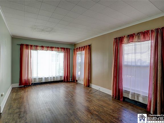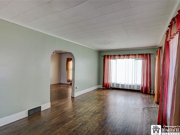 Charming home on the westside of Jamestown, NY. This well-maintained home sits on a classic Jamestown brick street. The living room is spacious and features hardwood floors that flow into the dining room. The dining room can accommodate a large table. The eat-in kitchen is galley style that makes prepping meals easy. There is a nice mud and laundry room off the kitchen. The main floor also features a bedroom with an attached half bath. The second level has two bedrooms and a full bath. The home is vinyl sided for easy maintenance. There is a covered back patio that overlooks the quaint yard. There is a detached two car garage. The front of the home has a covered porch. This home is move in ready!
