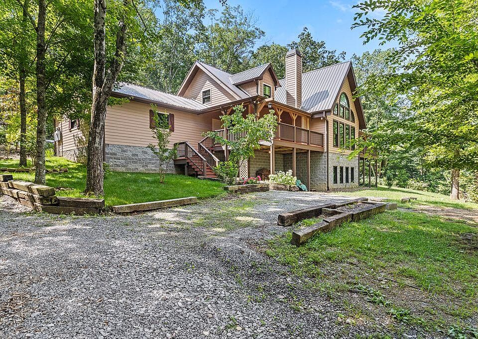 A private drive leads to this 3033 Sq ft post and beam lakeside retreat set within 3.61 secluded acres covered with mature hardwood trees on Fredonia Mountain. The 3-bedroom 2.5-bath craftsman home is move-in ready with a new metal roof, new exterior paint, and landscape touch-ups. The floor to ceiling windows surrounded by post and beam and tongue and groove ceilings open onto a tranquil 7 ac stocked lake.