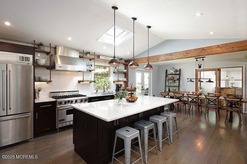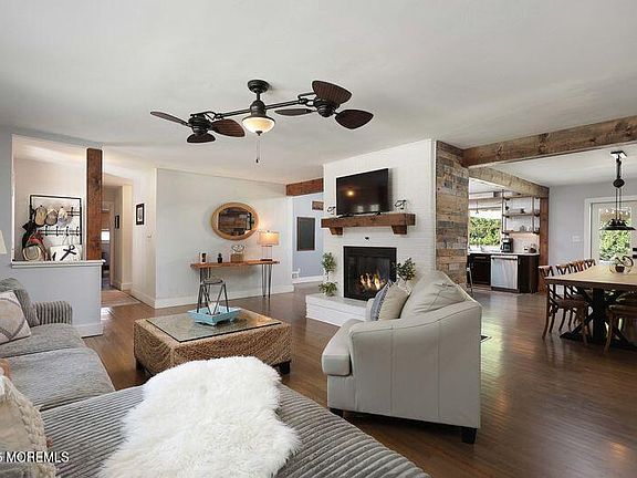 Patience is a virtue...this is the custom home that you've been waiting for that is just minutes to downtown Atlantic Highlands and the Sea Streak Ferry to N.Y.C. Designed for effortless single-floor living, this open-concept home combines designer style, comfort, convenience and a versatile lower level that is ideal for a recreation room, home office, gym, and additional storage. Outside, the fenced backyard provides a very private peaceful retreat for all. As you step into the welcoming foyer, you will be immersed in the warmth of the exquisite custom details and open floor plan. You will envision cozy fall and winter evenings gathered around the warm living room brick-hearth fireplace, awaiting guests to entertain in the heart of the home, a custom gourmet kitchen brilliant with natural light, vaulted ceilings, and a skylight. Cook with ease on your commercial Viking 6-burner stove as friends and family gather around the oversized Quartz Island, perfectly situated in front of another inviting fireplace accented by a striking pallet wood wall. The kitchen flows seamlessly into the dining area with direct access to the backyard patio and also extends into a sunroom wrapped in a wall of windows, creating a bright and welcoming space year-round. The private primary suite is a true retreat, featuring a renovated en-suite spa bathroom with custom finishes, double vanities, an oversized walk-in shower, and a spacious walk-in closet. The main full bath has also been custom renovated, boasting vaulted ceilings and a skylight that fills the space with natural light. Each additional bedroom offers a cozy escape with generous closet space, providing comfort and functionality. Other thoughtful amenities include a whole-house generator, a walk-out lower level with Bilco doors to the backyard, custom light fixtures and ceiling fans, recessed lighting, walk-in kitchen pantry, beautifully designed hardscaping and landscaping with front and back irrigation systems, and a large backyard shed for additional storage. Enjoy the convenience of strolling into town along charming sidewalks and tree-lined Victorian streets. Atlantic Highlands offers gourmet restaurants, unique local shops, and thriving businesses, all leading to the Sea Streak Ferry and marina, where you can take in stunning views of the NYC skyline framed by the rolling hills of Atlantic Highlands. You're also just a short drive from the best New Jersey Shore beaches, Red Bank, the Garden State Parkway, NJ Transit trains, and buses to NYC, making this location both picturesque and highly accessible. Now is your opportunity to become a local in the move-in ready gem!