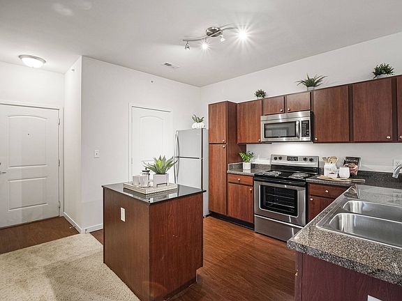 This awesome 1071 sqft 2 bedroom/2 bathroom floorplan features a huge kitchen with double sinks, stainless steel appliances, custom cherry cabinetry and hardwood laminate flooring, a floating kitchen island with granite countertop and additional storage, and includes a free full-size washer-dryer! Additional amenities include 9ft ceilings throughout, large bedrooms with a walk-in closet in the 2nd bedroom and 2 closets in the master, raised bowl vessel sinks in both bathrooms, a stand up shower in the master bathroom and a deep tub with curved shower rod in the guest bathroom.