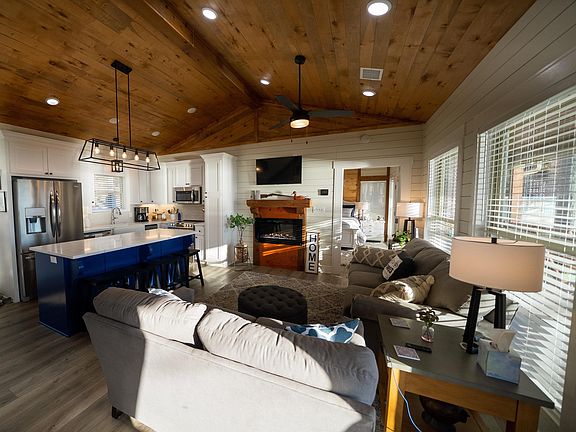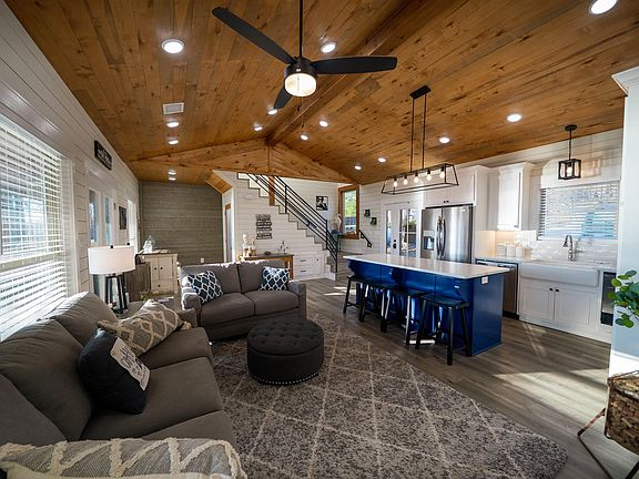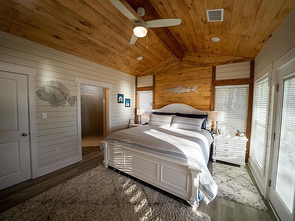 This 3-bedroom, 3-bathroom waterfront home is absolutely stunning and truly move-in ready. Step inside to a cozy, charming farmhouse feel featuring beautiful shiplap throughout and soaring aspen wood ceilings that add warmth and character. The open-concept living area is filled with natural light from large windows that frame breathtaking lake views. The kitchen is designed to impress, offering custom cabinetry that maximizes every inch of space, stainless steel appliances, a large farmhouse sink, and a massive quartz island perfect for entertaining. A walk-in pantry is conveniently located just off the kitchen near the dining area. Luxury vinyl plank flooring runs throughout the home, providing both durability and style. The primary suite is located on the main level and features a spacious walk-in closet and double doors leading to the covered deck, allowing you to wake up to stunning water views. The ensuite bath includes quartz double vanities and a custom marble shower. A second bedroom and full bath are also located on the first floor. The staircase leads to the second level, where you’ll find a large 10x20 balcony—patio furniture will remain with the home. The third bedroom offers oversized windows for abundant natural light, and the upstairs bathroom features a quartz vanity and shower/tub combo. Outside, the covered deck stretches the full length of the home, providing ample space to grill, host guests, or enjoy your morning coffee. The property boasts 150 feet of waterfrontage, a concrete seawall, boathouse with electric lifts, and a perfect swimming area for kids. Additional features include a 2-year-old generator, 2-year-old HVAC system, and a 20x40 metal shop ideal for car and boat storage, complete with a 50-amp plug. An additional 300 sq ft space within the shop, with large windows, is ready to be finished as an apartment with room for a bedroom, bathroom, and kitchen. Start enjoying beautiful Lake Claiborne, making memories that last a lifetime!!!