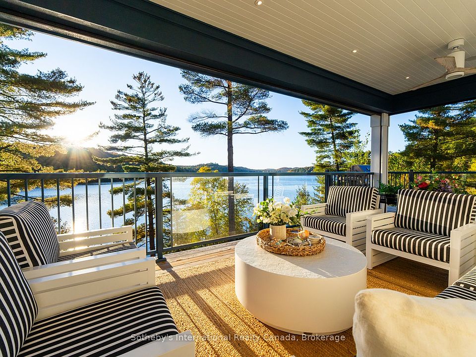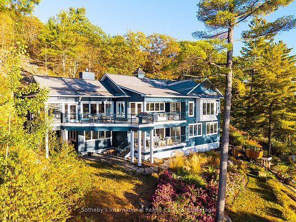 Embrace breathtaking sunsets with over 650 feet of southwest-facing frontage on beautiful Lake Vernon. This fully automated six-bedroom, five-bathroom cottage is a perfect retreat for families and entertaining. Step inside to a spacious layout designed for stunning water views. The large kitchen, living, and dining areas ensure you capture the beauty of the lake from every angle. The main level features a luxurious primary suite with windows on three sides, his and hers vanities, a separate water closet, and a walk-in closet. A guest suite with an en-suite offers added privacy. Downstairs, four additional bedrooms and two bathrooms provide ample space for family and friends. Enjoy seamless indoor-outdoor living with multiple heat-treated ash decks outfitted with motorized screens, transforming your Muskoka room into an open-air deck at the touch of a button. For boating enthusiasts, a covered boat port and oversized dock await you, perfect for sunset cocktails or lounging by the shore. A charming tree grows through the deck, adding unique character, and an inclinator is conveniently available for easy access to drinks....no heavy lifting required! The cottage is heated and cooled by a modern heat pump, eliminating the need for frequent propane refills. Located just a one-minute boat ride from the marina, 800 Big Island is not just a cottage; its a magical retreat you have to see to believe. Schedule your visit today!