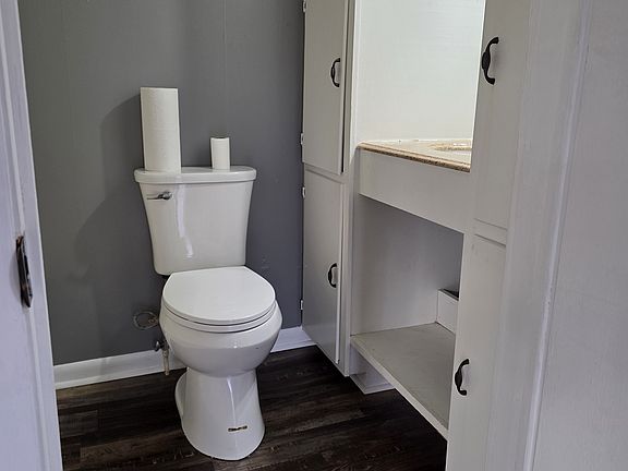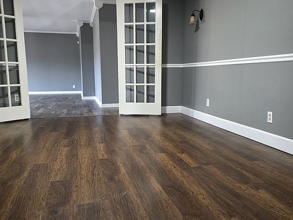Step into this beautifully updated home that blends rustic charm with simple elegance. The spacious interior features rich dark wood flooring throughout, complemented by soft gray walls and crisp white trim for a clean aesthetic. Natural light pours in through large windows and French doors, creating a warm and inviting atmosphere in every room.