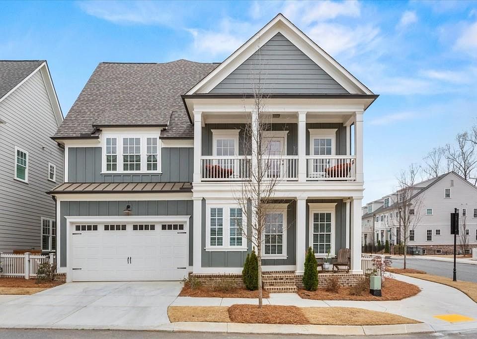 This beautifully designed home in the sought-after South on Main community is just a short walk from Downtown Woodstock. Thoughtfully upgraded, this home blends style, function, and modern convenience across three spacious levels. The exterior showcases charming Southern-inspired architecture with a welcoming front porch and a second-story balcony, perfect for morning coffee or evening relaxation. Inside, the open-concept main level is designed for entertaining. The great room features a stylish fireplace with a custom wood mantel, flanked by built-in shelving, creating a cozy yet modern gathering space. The dining area connects seamlessly to the kitchen, where a stunning deep teal subway tile backsplash, custom cabinetry to the ceiling, and sleek open shelving make a bold statement. A large island with quartz countertops, premium stainless appliances, and a gold-tone faucet add elegance and practicality. Adjacent to the kitchen, a covered side porch offers a great space for grilling and easy access to the fenced courtyard. The upper level is home to a spacious primary suite, featuring a serene sitting area, tray ceiling, and ample natural light. The ensuite bath is a retreat in itself, complete with double vanities, a soaking tub, a walk-in shower, and two generous walk-in closets. Two additional bedrooms share a well-appointed bath, while the convenient upstairs laundry room includes built-in storage and a utility sink for added functionality. On the third level, a versatile bonus room provides the perfect space for a home theater, playroom, or relaxation zone. An additional bedroom and full bath make this level ideal for guests, a home office, or a personal fitness area, which is beautifully showcased in the listing's images. The community offers 20 acres of parks and green space, a community garden, a fire pit, and a resort-style swimming pool with a splash pad and cabana. Residents enjoy exclusive access to a 6,000-square-foot clubhouse with a fitness center, conference room, and game area. Outdoor amenities include a playground, two dog parks, an open-air pavilion, "The SHED" stage, and direct access to the Noonday Creek Trail, part of the extensive Greenprints Trail System with nearly 60 miles of hiking and biking paths. And just steps away, Downtown Woodstock offers an array of boutique shopping, dining, and live entertainment, including the Northside Hospital Cherokee Amphitheater.