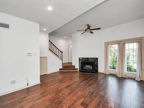 Welcome to this beautifully updated corner-lot townhome in the Energy Corridor, featuring abundant natural light, soaring ceilings, and modern finishes throughout. The open living area offers wood floors, recessed lighting, and a cozy fireplace with access to a private patio. The open concept kitchen has granite countertops, a large island, pendant lighting perfect for cooking and entertaining. A conveniently located laundry area is just off the kitchen for easy multitasking. Upstairs, the spacious primary suite boasts a private balcony, walk-in closet, and ensuite bath with dual sinks and an updated shower-tub combo. A generous secondary bedroom with laminate floors and natural light, plus a second full bath with a walk-in shower, complete the upstairs. Additional highlights include an attached garage, nearby community amenities, and water and trash included. Conveniently located near I-10, Beltway 8, shopping, dining, and zoned to the highly regarded Spring Branch ISD.