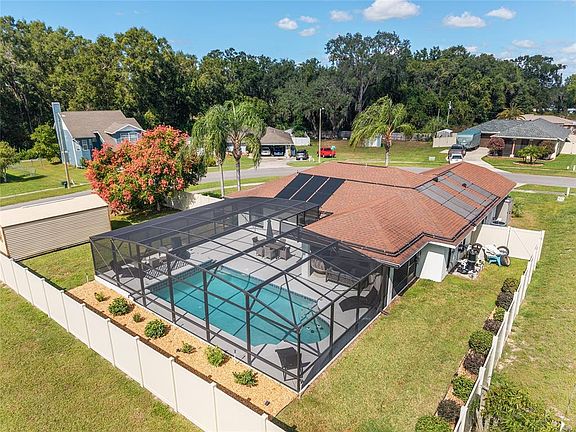 Stunning Pool Home with In-Law Suite Near Brownwood! Discover this beautifully updated 3-bedroom, 2-bath pool home in a prime Wildwood location, just minutes from Brownwood Paddock Square, new restaurants, and shopping! This home is packed with upgrades and modern features, including new luxury vinyl plank flooring, roof (2016), HVAC (2023), new screen enclosure, and a renovated guest bath with a custom tile walk-in shower plus new vanities and sinks in both bathrooms. Enjoy energy-efficient solar panels for pool heating, a new shed (conveys), and a new fenced yard. The converted garage offers an incredible 2-bedroom, 1-bath guest suite — ideal for an in-law suite, extra living space, or rental opportunity. You’ll love the sparkling pool, perfect for entertaining or relaxing in your private Florida oasis. The home has been freshly painted and features unique design touches, including a stunning floor-to-ceiling fireplace and modern lighting throughout. This is a must-see property with character, functionality, and unbeatable location — schedule your showing today!