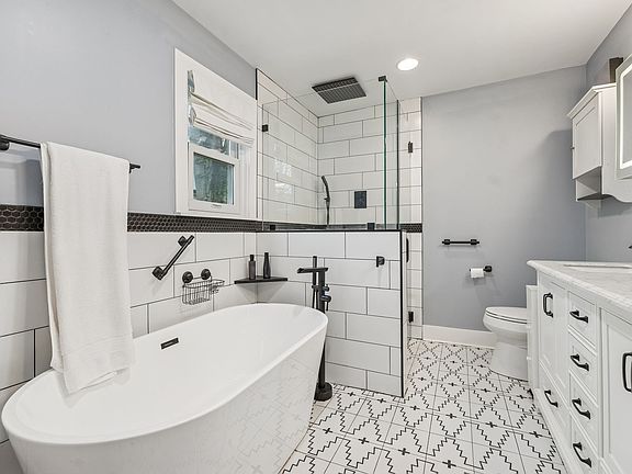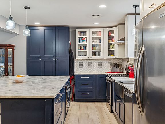The remodeled chef’s kitchen anchors the home with an oversized island, custom blue-and-white cabinetry, leathered quartz countertops, roll-out shelving, hidden trash drawer, built-in drawer microwave, stainless appliances, farmhouse sink, gas range, and generous storage. The flexible floor plan offers four bedrooms, with the fourth ideal as a home office or den. Both bathrooms feature roll-in showers, marble countertops, and lighted mirrors, while the primary suite includes dual vanities and a freestanding soaking tub. An electric fireplace with built-ins adds warmth to the main living space, and a large mudroom/laundry area with utility sink provides everyday functionality. Combination washer/dryer remains.