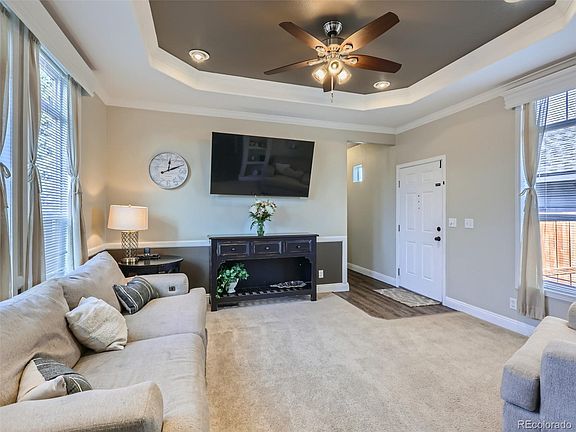 - Description: Coffered Ceiling. Ceiling Fan. Built-In, Decorative Shelving.