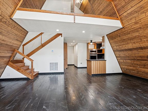 Set among mature trees, this completely custom home showcases cherry cabinetry and stairway, handcrafted loft railing, solid hardwood doors, tongue-and-groove angled ceilings, and tiled bathrooms with walk-in showers. The open living area radiates warmth and character, while custom cherry wood exterior doors invite the outdoors in.