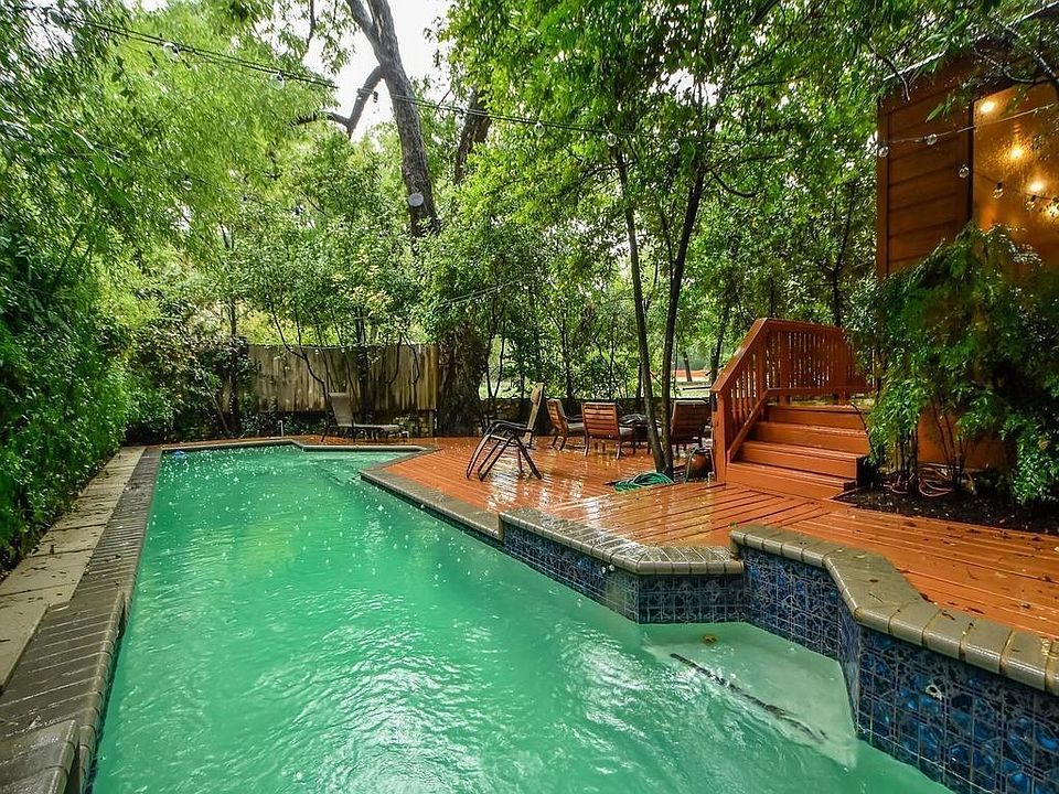 This inner city Oasis is one of a kind! At the end of a quiet dead end street that sits on Waller creek. Across the street from the UT law school, and next to Eastwoods Park. This home has so much to offer including a heated lap pool, expansive decking, enclosed porch, modern kitchen w/ Island and tons of space and storage. Text Laura for a viewing