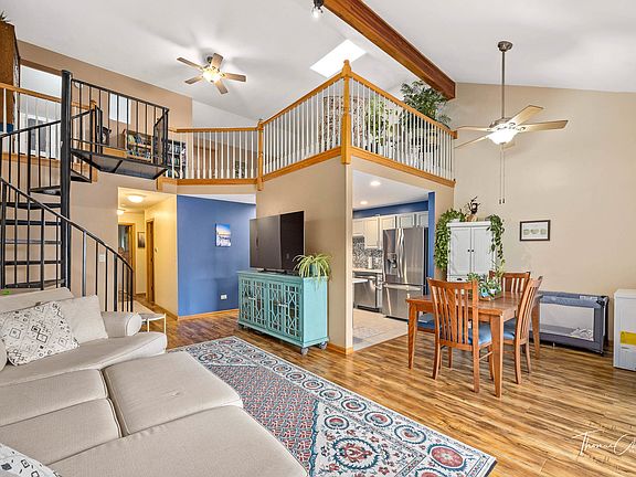 Beautiful and spacious 2nd floor condo unit that offers over 1600 SF of living space. This condo features 2 bedrooms and 2 full bathrooms with a 1 car garage. So much open living space here - the main floor has a living room, separate dining room and generous size kitchen. Spiral staircase off the living room leads to a huge loft that can be used as separate flex space or additional living space. The kitchen was updated in 2022 to include new stove, microwave, refrigerator, dishwasher, can lighting, refurbished cabinets, backsplash, quartz countertops, and farmhouse kitchen sink. Patio doors from the dining room walk onto the outdoor balcony and offer alot of natural sunlight. Laundry room on the main level includes newer washer & dryer (2022). Primary bedroom includes primary bathroom suite. Other upgrades include: water heater (2022), central humidifier (2023), new toilets (2022), new NEST t-stat (2022), new garage door opener (2023) and kitchen and hallways were freshly painted (2023). Condo includes 2 assigned parking spaces - 1 in the covered garage and 1 in the in the parking lot out front. Close to downtown area with Metra train station, schools nearby, shopping/restaurants and minutes from 355 expressway. Check this one out before it is gone! HOA dues are $210/month.