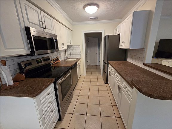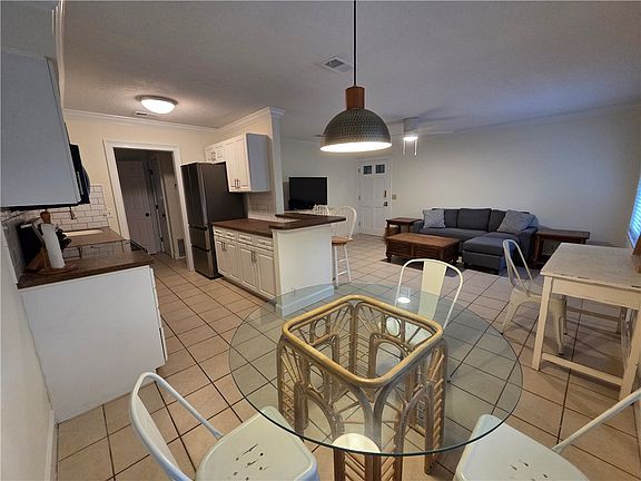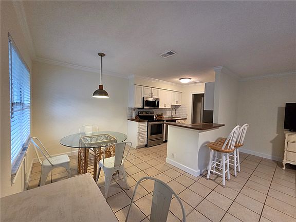 The unit has been updated with stainless steel appliances, newer fans and light fixtures, modern faucets, and tile/LVP flooring throughout. The kitchen has been opened up for a more spacious feel, and crown molding adds a polished touch. There is a balcony off the primary bedroom, perfect for relaxing outdoors. A stack washer and dryer are located inside the unit for convenience, and the community laundry facility is right next door for larger loads.