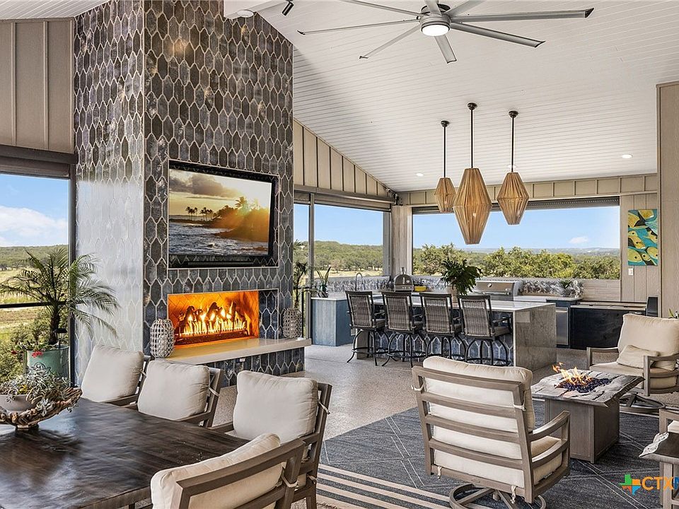 Cinematic lake and hill country views greet you through the custom wrought iron pivot door and continue throughout the home. Soaring cathedral ceilings, hammered porcelain floors, and expansive windows create a seamless indoor-outdoor experience.