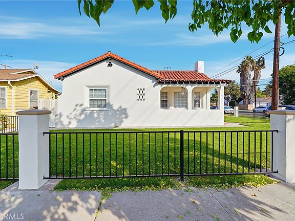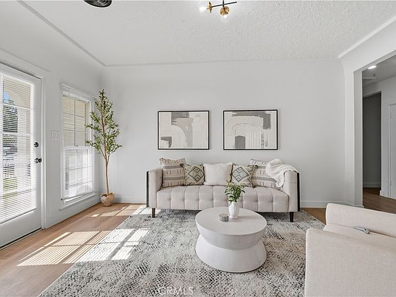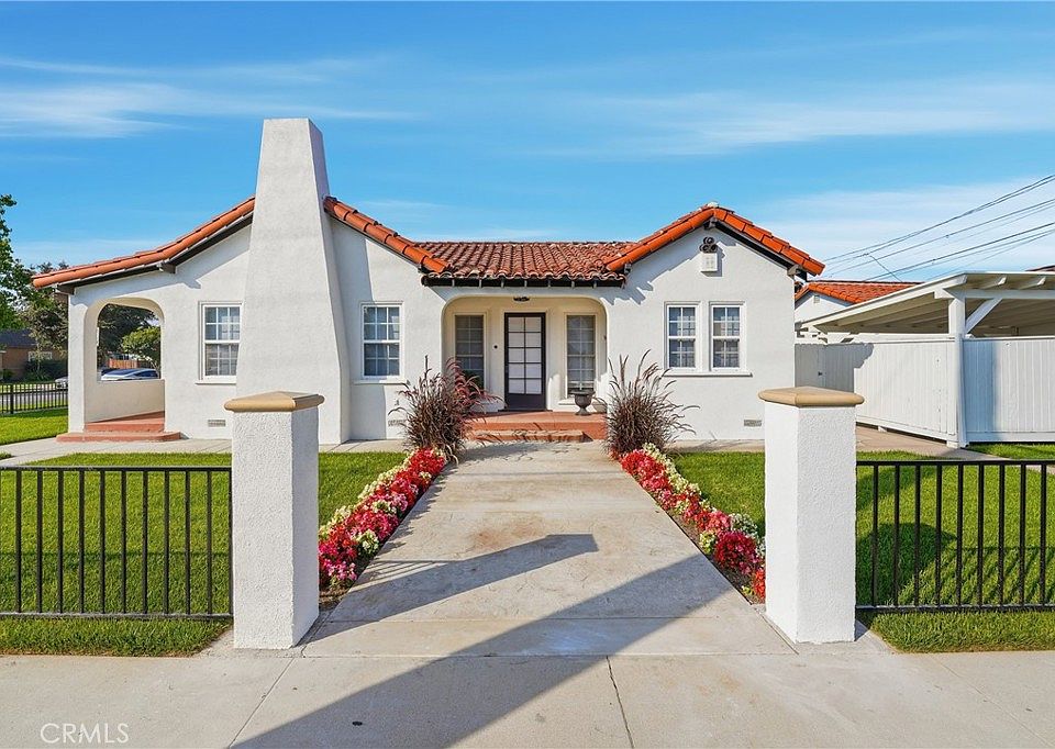 Welcome to this captivating and beautifully updated Spanish-style home located in one of most desirable Anaheim neighborhood, situated across the way from Colony District. This stunning residence offers 4 bedrooms, 2 bathrooms, and 1,450 sq ft of bright, modern living space, all situated on a generous 6,560 sq ft lot. The home makes a memorable first impression with its exceptional Spanish architecture, featuring a classic tile roof, white stucco exterior, and charming gated walkway framed by vibrant flower beds. This historic character is beautifully preserved, creating truly unique curb appeal. Step inside to a move-in ready interior that blends classic charm with contemporary comfort. The main living areas showcase beautiful wood flooring and a fresh, crisp white color palette, creating a bright and airy atmosphere. The functional kitchen is well-appointed with charming wood cabinetry and sleek grey countertops, providing a warm and efficient space for cooking and gathering. Washer and dryer hookups are conveniently available. This property excels in utility and outdoor enjoyment. The backyard features a delightful separate covered lounge area, offering a perfect, shaded spot for relaxing, dining al fresco, or entertaining guests. Add an ADU for multi-generational living. Great potential valuable asset is the spacious detached 4-car garage, which includes abundant built-in shelving and storage, providing excellent potential for a workshop, home gym, or secure parking. Residents enjoy proximity to local amenities, schools, and parks, with easy access to major thoroughfares including the 5 and 91 Freeways, making commuting and navigating Southern California convenient.