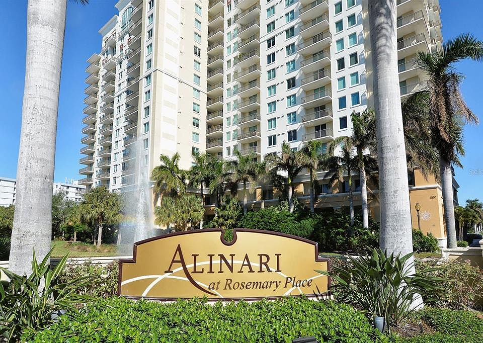 Welcome to Alinari at Rosemary Place, where every day revolves around effortless downtown living. Perfectly positioned on eleven lush acres in the heart of Sarasota, Alinari captures the essence of city life with tranquil modern comfort. Set above the city, this refined 15th floor residence offers 1,310 square feet of living space, featuring 2 bedrooms and 2 baths within walking distance to the vibrant culinary, cultural, and art scene. Step inside to a bright open living area with tile flooring throughout that enhances the spacious atmosphere. The airy feel of the living room with high ceilings makes it a fantastic space for hosting guests in style with an outdoor terrace with city views. The open kitchen includes a breakfast bar, wood cabinets, stainless-steel appliances, granite countertops, and pantry. Enjoy your morning coffee on the terrace adjacent to the living room, designed for al fresco enjoyment against a backdrop of city skyline. The primary bathroom features two separate vanities, a glass walk-in shower, bathtub, and walk-in closet. The floor plan offers a guest room with a walk-in closet and a full bath to provide a retreat for the family. A laundry room, with extra storage space, is conveniently located near the entrance. This residence boasts architectural features including a tray ceiling in the kitchen and decorative crown molding in the living room. One unique amenity stands out: three guest suites are available in the building to accommodate additional overnight guests. The unit includes hurricane rated sliding doors, secure parking with one assigned spot and 24/7 security, ensuring peace of mind. The Alinari offers a lifestyle enhanced by legendary services and desirable amenities including: 24/7 concierge service, business center, a heated pool and spa, fitness center, sauna, massage room, and an oversized club room and kitchen for gatherings. Take advantage of their climate-controlled wine room with private storage lockers. Additional conveniences include a theater with stadium seating, card and billiard room, business center, storage, EV charging stations and secure under building parking. The Alinari offers a large, privately owned fenced green space for pets and parties and additional codominium-owned development land. Just minutes away from Bayfront Park, Van Wezel Performing Arts Hall, St. Armands Circle, and Lido Beach, this condo offers the perfect blend of comfort and convenience. Whether you are looking for that perfect home, or investment property as a rental, do not miss the opportunity to experience upscale downtown living at its finest.