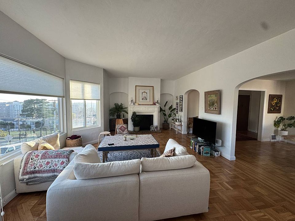 Two generous bedrooms with walk-in closets. The primary bedroom features a west-facing window with panoramic views of the Pacific Ocean, Marin Headlands, and spectacular sunsets. Large living room with working fireplace and parquet floors.