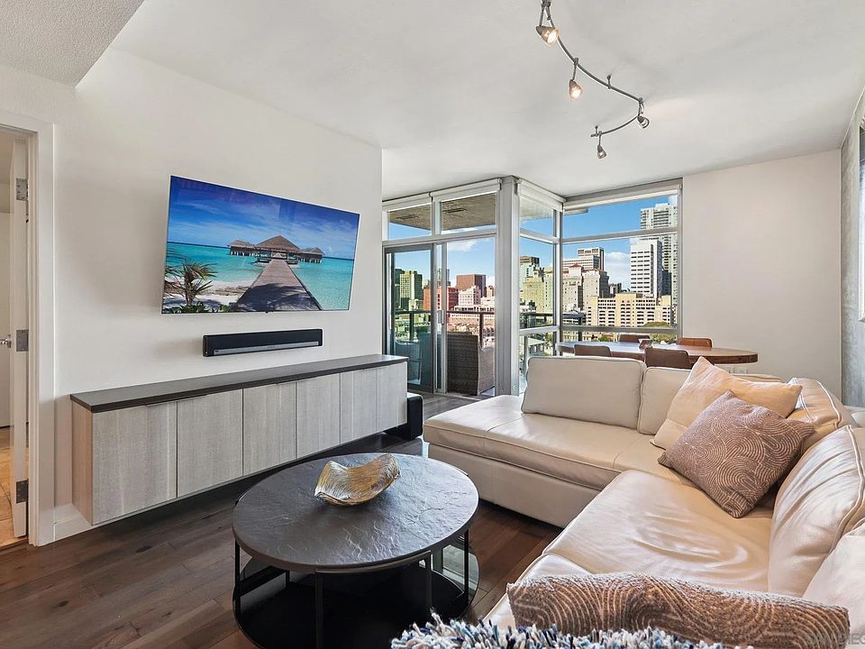 Experience elevated urban living in this beautifully updated residence at The Mark, one of East Village’s premier luxury towers. Ideally located just steps from Petco Park yet positioned away from noise and traffic, this home offers the perfect balance of excitement and comfort. The Gaslamp Quarter, Little Italy, and San Diego’s waterfront are all just moments away, placing the best of downtown at your doorstep. Inside, the open floor plan showcases sweeping city views. The spacious living area includes a built-in media console and a flexible dining space that can also serve as a workspace—perfect for taking in the skyline while you dine or work. A covered balcony extends the living area outdoors with expansive city and peek-a-boo bay views. The generous bedroom offers room for a desk and features a walk-in closet with a custom California Closet system. The oversized spa-like bathroom is accessible from both the bedroom and living area. The open kitchen is ideal for entertaining, complete with stone countertops, Studio Becker soft-close cabinetry, stainless steel appliances, breakfast seating, and abundant storage. Notable upgrades include an HVAC system with UV filtration, Ecobee thermostat, newer countertops, newer refrigerator, and full-size LG front-loading washer and dryer. The Mark offers exceptional amenities - concierge, newly updated saltwater pool/spa, upgraded courtyard with pizza oven, BBQs, lounge areas, state-of-the-art fitness center, and conference room. VA approved, this home offers resort-style living in the heart of Downtown San Diego.
