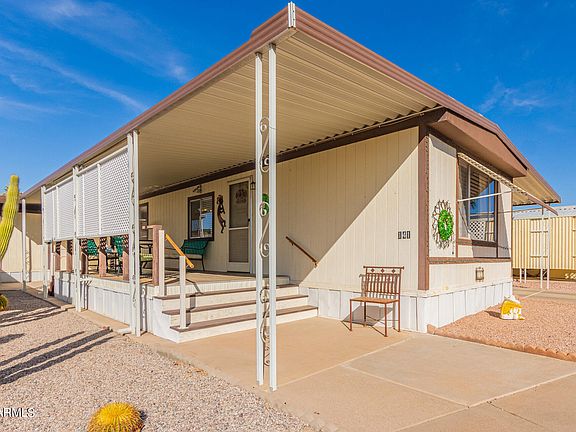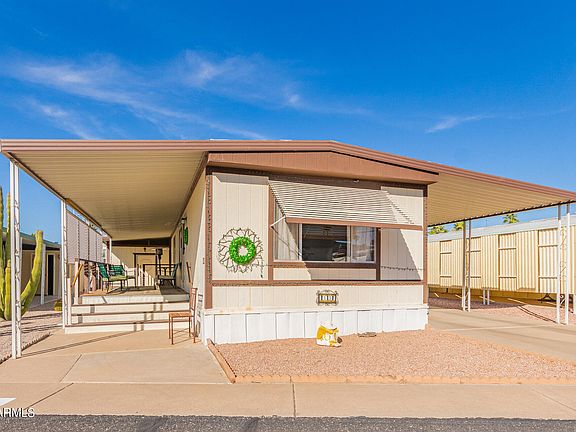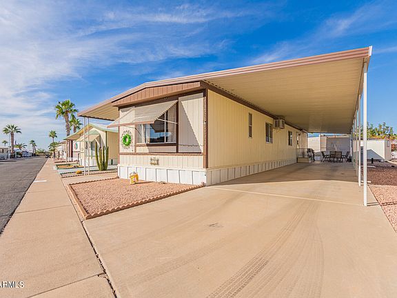 Charming FULLY FURNISHED manufactured home in the active adult Sky Haven Estates! With 2 beds & 1.75 bath, it's comfortable living. A desert landscape & carport parking spaces are just the beginning. Continue inside to find a semi-open layout with tons of natural light, soothing palette, and carpet & tile flooring in all the right places. The eat-in kitchen w/pantry and light blue cabinetry with pull-out shelves. Well-appointed bedrooms & 1.5 baths for added convenience! Adding to home's functionality, you a separate workshop, ideal for hobbyists & craftsmen alike, offering ample space for projects and storage. Take advantage of the amenities of this gated Community, including a pool, clubhouse, & etc. Don't miss it