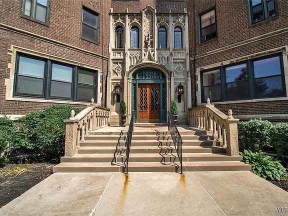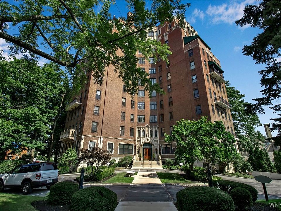Fantastic condo in one of Buffalo's premier buildings! 800 West Ferry, designed by Duane Lyman, boasts exceptional 1920s architecture, a spectacular lobby with gorgeous details, and convenient walkability to Elmwood Village shops and restaurants. This turn-key one-bedroom unit is a perfect blend of classic features and thoughtful modern updates! Entryway with ample coat nook leads to convenient and modern half bath. Spacious, bright living room boasts gleaming, refinished parquet floors, decorative fireplace centerpiece with mantel, traditional built-in bookshelves, and plenty of natural light! Opens to beautifully upgraded kitchen with granite countertops and breakfast bar, bonus pantry space, stainless appliances, and gorgeous fixtures. Gracious primary suite is a true sanctuary, offering extensive built in storage, and en-suite bath with tub/shower and beautiful vanity. Additional attic storage and designated, off-street parking space included! Enjoy 24 hour security, common terrace space, and all utilities included in HOA. Location can't be beat; great proximity to Delaware Park, Medical Campus, theatre district and more. Building is in a historic district; qualifies for SHPO tax credits for home renovation projects that qualify!