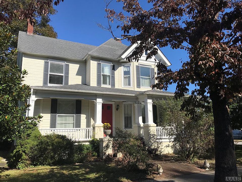 Lovely turn of the century home with 4 to 5 BRs and 2 full baths. L-shaped kitchen and 4.5X8 pantry open to utility room. Large deck off kitchen leads to wonderful garden-like back fenced yard. Vinyl sided for low maintenance! Half-wrap porch and 2 sidewalk entries. Large hallway (25' long) from front ante-foyer leads past living areas into kitchen. Gas logs in den and glass-front built-ins in DR. Carpets over wood floors and tiled kitchen and master bath floors. Master bath has new double vanity and lighting; walk-in shower. Tub/shower on 2nd floor in bathroom with door to attic steps.