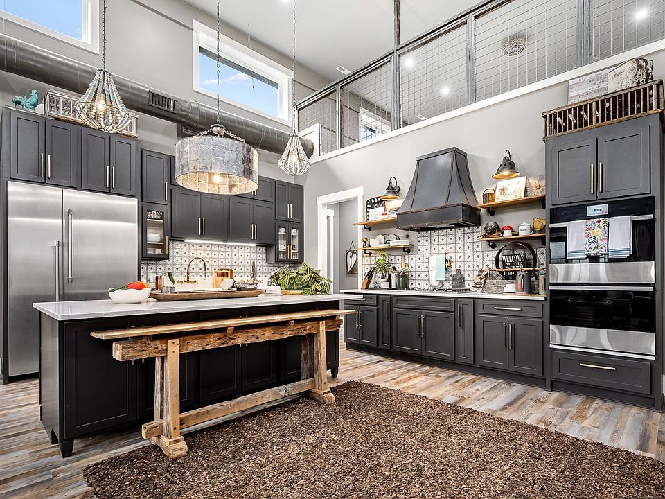 The heart of the home is the gourmet chef’s kitchen, complete with quartz countertops, a 6-foot antique sink with double faucets, top-tier, high-end luxury appliances, a custom range hood, and endless custom touches. The open-concept living area is perfect for entertaining, showcasing exposed ductwork, a stone fireplace with gas logs, and durable yet elegant hardwood-style LVP flooring. Upstairs, a spacious media room loft offers the perfect retreat for movies or relaxation.
