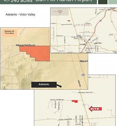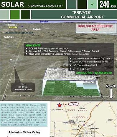 240 Acres-"Private" Commercial Airport. Potential Renewable Energy Site. State Of California Class 1 'Commercial' Airport Permit. Airpark Community/ Industrial Development Opportunity. Potential 350 Lots. Zoning Allows Planned Developments. Appraisal @ $6,600,000. OMC with qualified Buyer. '