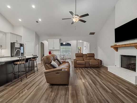 Modern Ranch layout w/Inviting Entry Foyer, Formal Dining Room, Spacious Great Room w/Gas Fireplace creates the perfect unwind space. Spacious Kitchen w/Stylish Cabinetry, Quartz Countertops, Tiled Backsplash. The Luxury Kitchen includes Gas Cooktop, Stainless Vent Hood, Built-in Double Oven & Built-in Microwave. Large Kitchen Island open to Breakfast Area & Walk-in Pantry for Additional Storage. Owner's Entry equipped with Cubbies Creating an Ideal Family Catch all. Split Bedroom Plan creates a Spacious Owner's Suite w/ French Doors leading to the Back Porch. Owner's Bath has a Luxury shower, Huge 10' Double Vanity, Separate Water Closet, & Walk-in Closet. Two Additional Bedrooms with Jack & Jill Bath. Third Additional Bedroom has access to the Back Porch, w/Full Bath nearby, creating the perfect Guest Suite. Enjoy Durable LVP Flooring. The covered Back Porch w/FP is a must see. Plenty of Space for Grilling & Relaxing with family while watching the game! This home will not last long!