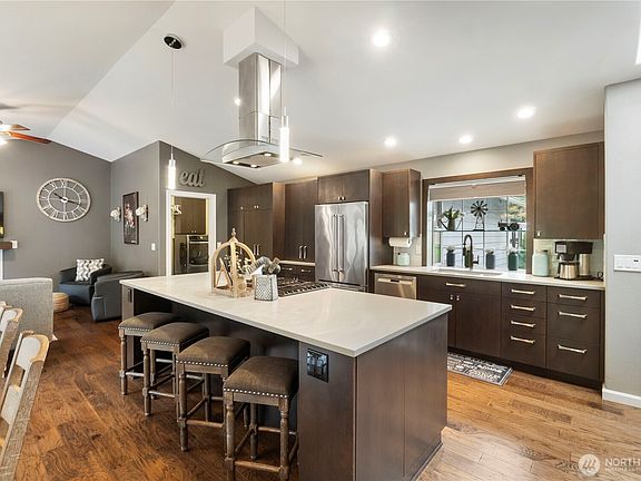 Maintained w/Tender, Loving, Care. This 2672 Sq Ft Day-light basement RAMBLER on a 1/4 Ac lot 4Br/2.75BA has it all! Primary on the main, Shiplap decor, walk-in Closet, Towel warmer, under counter motion sensor. Entertain in your Chefs Kitchen, Vaulted Ceilings, Quartz countertops, Custom Cabinets w soft close throughout, Engineered Hardwoods, Skylight & gas fireplace. French doors lead to a Freshly painted deck. Jr Kitchenet Suite below w/large bedroom. Wet Bar, Wine Fridge, cement Countertops, In-ceiling speakers and all electronics stay in the built in wall unit. Step out to the patio and take a dip in your Hot Tub AND watch TV! Roof, 2019, Furnace/AC/ H/W tank 2021. Garden space, sprinklers f/b. No HOA, RV, walk to Lake Bonney Lake.