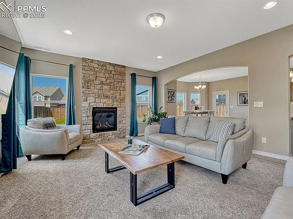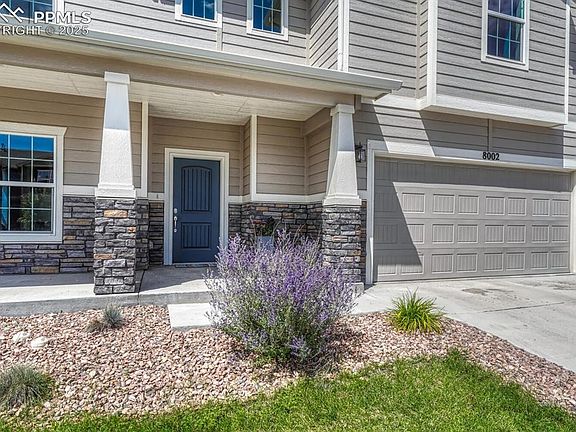 Welcome to this beautiful 2021-built two story in Bent Grass. Covered front porch draws you into this comfortable three-bedroom, three-bathroom home with attached three car tandem garage. Airy nine-foot ceilings and light-colored plank flooring grace the main level. Glass French doors open to private office overlooking the entry. The gorgeous kitchen is the heart of this home. Staggered height light maple cabinetry with crown molding, light quartz counters, and tile backsplash are perfection. Island features undermount stainless steel sink, pendant lights, and bartop seating. Pantry, under cabinet lighting, stainless steel appliances with gas range create and elevated culinary space. Dining room is framed by bay window overlooking back yard, and walks out to covered patio for grilling. Living room’s stone-surround gas fireplace adds warmth and character. Upstairs primary suite is a retreat with double-door entry, mountain view, and attached spa-like bath with tile floor, soaking tub with Pikes Peak view, and separate shower. Double vanity with quartz counter and walk-in closet provide abundant space. Second and third bedrooms have walk-in closets and share an attached full bath. Fun upstairs family room is great for relaxing – large enough for a TV area, game space, and more. Laundry room includes washer, dryer, and sink. Central air is included, as are all mounted TV screens. Three car tandem garage is drywalled, insulated, and very well lit – ideal for much more than just parking: Try hobbies, storage, or a home gym. Set on nearly a fifth of an acre, you’ll have lots of room to play! Lawn is well-maintained, fenced, and ready with auto sprinklers. Conveniently located near Woodmen and Marksheffel, you’ll enjoy D49 schools, Falcon shopping, northern Colorado Springs services, and quick access to Denver via I-25 or Hwy 83. This worry-free home in a great location invites you to create new memories surrounded by mountain vistas and timeless design. ASSUMABLE LOAN.