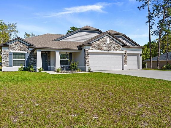 2021 BUILT 4 bedroom PLUS OFFICE/DEN, 3 full bathroom, 3 CAR GARAGE situated on just under a HALF ACRE lot. This home has it all! You will immediately notice the stone detail on the front of the house along with the wide driveway and charming front porch. Enter through the front door and you will be wowed by the light and bright open concept design with high ceilings and recessed lighting throughout. The formal dining area is perfectly located just off of the kitchen and open to the family room. To your left, double doors open to your home office, den, gym or playroom. The possibilities are endless. The kitchen features new stainless steel appliances, QUARTZ counter tops, a pantry and HUGE ISLAND plus a dinette area that looks out onto the backyard. The spacious master bedroom suite includes a walk-in closet and private bathroom with walk-in shower plus a garden tub. This floorplan perfectly splits the guest areas giving you one bedroom and bathroom towards the front of the house and the remaining two bedrooms and bathroom towards the rear. Out back you will find a covered and screen-enclosed lanai that looks out onto your massive backyard. All of this PLUS the house is prewired for a home theater surround sound system, upgraded 18" ceramic tile flooring in all living areas, and upgraded lighting.