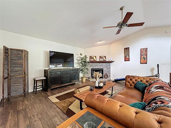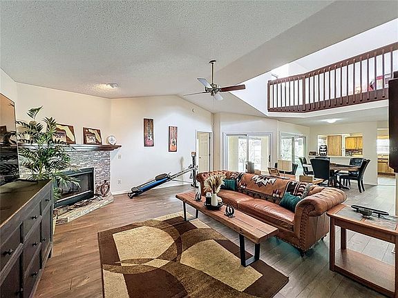 Discover the perfect blend of comfort, convenience, and Florida charm in this inviting Mediterranean-style home, ideally situated in Orlando just minutes from the magic of Disney World, the thrills of Universal Studios, and the vibrant entertainment of International Drive. With its classic tile roof and private built-in pool, this 3-bedroom, 2.5-bathroom gem offers a serene retreat for families or anyone seeking an effortless lifestyle. Step inside to soaring tall ceilings in the main living area, creating an open and airy ambiance. The spacious living room features a cozy fireplace adorned with elegant stacked stone, perfect for gatherings. Flow seamlessly into the formal dining room and eat-in kitchen, all with pool view and boasting durable wood plank laminate flooring that extends through the foyer, two spare bedrooms, and two bathrooms. The kitchen is designed for everyday ease, while the large loft area upstairs provides versatile space for a home office, playroom, or media den. Practical touches include an inside laundry closet and a convenient 2-car garage. Retreat to the luxurious primary suite, complete with sliders opening directly to the sparkling pool and patio for that ultimate indoor-outdoor flow. The en-suite bathroom is a spa-like oasis, featuring dual walk-in closets, a private toilet closet, a large updated shower with a soothing rain shower head, a double sink vanity, and a relaxing garden tub. This bath also doubles as a pool bath with exterior access, adding convenience for outdoor entertaining. The two additional bedrooms offer ample storage - one with a walk-in closet and the other with a standard closet - connected by the shared Jack-and-Jill bath. Throughout the home, enjoy the benefits of windows replaced in 2014 for enhanced energy efficiency and natural light. Outside, your private pool and patio beckon for fun and relaxation, while the community takes care of the details: HOA fees cover lawn mowing and hedge trimming, and reclaimed water from the nearby lake irrigates the yards to keep water bills low. Residents also have access to fantastic amenities, including a community boat ramp, park and playground, and tennis courts. This great haven combines style, functionality, and prime location. Don't miss your chance to call it home!