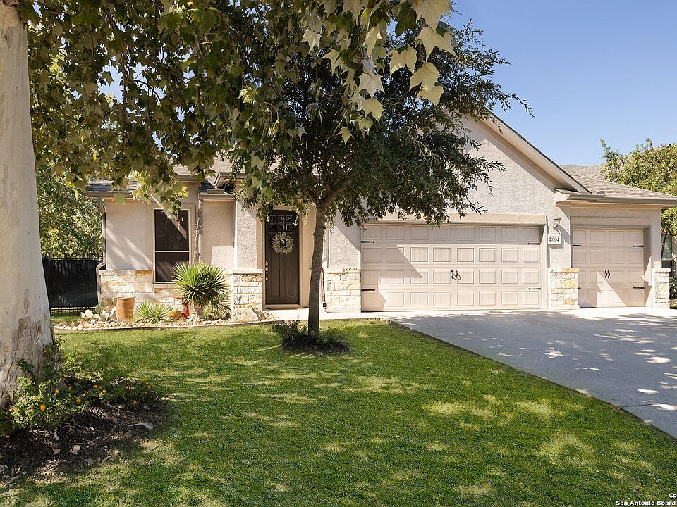 Hill Country convenience and Fair Oaks Country club easy access. This eloquent setting makes for great privacy and convenience and could be enjoyed by a family looking to raise kids or great for empty nester with wonderful convenience to San Antonio and Boerne. Main House 2039 square feet with 3/2 with open living areas offers tons of space. Gorgeous one-story home is nestled in the Trailside of Fair Oaks Ranch community offering stunning interior features. This home sits on a corner lot with stunning mature trees. The beautiful exterior is clad in tasteful stone and stucco. Inside, the open floor plan allows for entertainment at ease. A wonderful flex space off the entry can double as a formal dining or secondary living space of great for family with kids or even a secondary office for those working from home The culinary chef is sure to enjoy in the gourmet kitchen equipped with espresso-colored cabinetry, mosaic tile backsplash, complementing the granite counters, a custom island with bar seating, and a walk-in pantry. The kitchen area opens to a grand oversized living space with plenty of natural light, high ceilings, access to the outdoors, and room for an entertainment center. Dedicated office space can be found off the living room with French glass doors. Don't miss this special primary suite with bay windows, plenty of space for sitting area, oversized walk-in closet and accessed through double doors. The recently updated oversized shower offers a stunning tile design surrounding a beautiful light color palette. Two secondary bedrooms complete the interior. Outside, enjoy the seasons change on the shaded extended patio overlooking the meticulously maintained lawn with room to add a pool. Friendly, peaceful community with emphasis on education near Fair Oaks Ranch Country Club, Endless recreational opportunities. Beautiful, lush backyard with space to enhance entertainment, and corner lot to ensure privacy. Oversized 3 car garage is wonderful space for storage, parking and workshop. Boerne Schools.