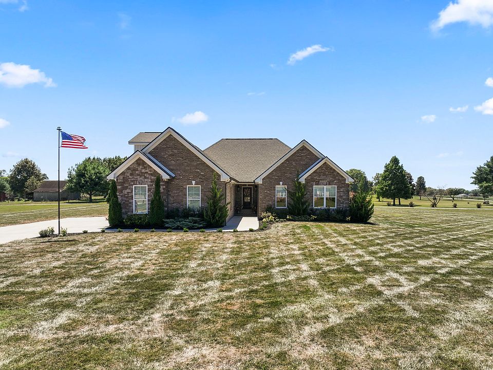 Welcome to this beautiful brick home situated on a spacious one-acre flat lot with mature landscaping and plenty of room to enjoy the outdoors.From the moment you arrive, the curb appeal and peaceful setting will impress. Inside, the home is filled with thoughtful upgrades and timeless design, including custom cabinetry, granite and quartz countertops, and a show-stopping stone hearth that anchors the living space.
