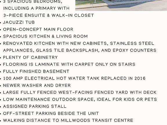 End unit townhouseFully fenced west-facing yardEstablished perennial gardenNew cabinetsStainless appliancesGlass tile backsplashDurable epoxy counters