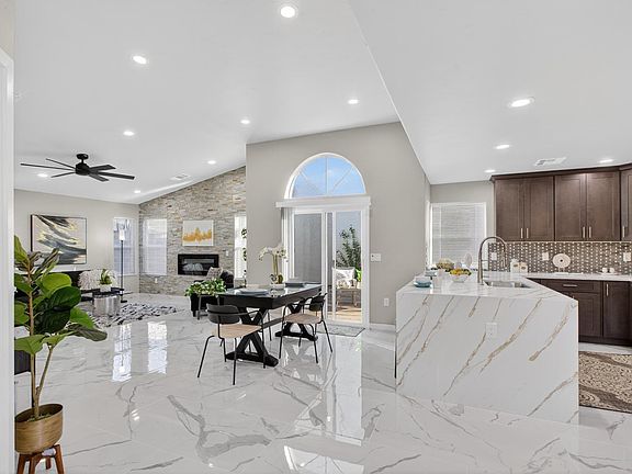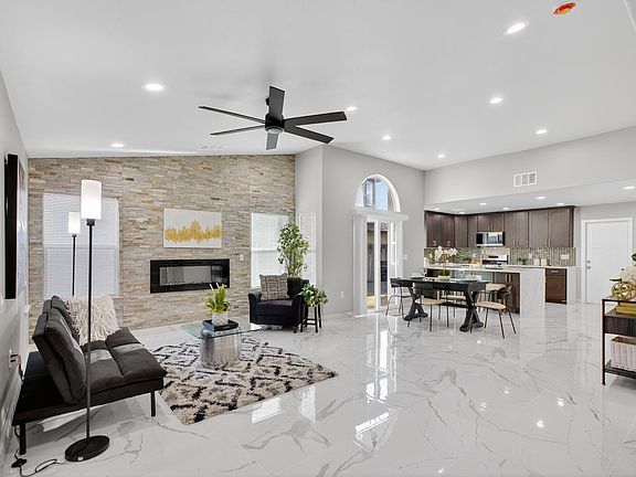 Striking stone fireplaceWaterfall-edge quartz countertopsStylish new bathroomsOpen-concept layoutElegant marble flooringFully renovated homeHigh-end stainless-steel appliances