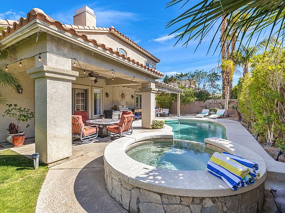Resort style living at its finest located inside the gates of the Indian Springs Country Club with all the amenities. Fitness center, clubhouse, pools, golfing and more. Centrally located close to everything. 5 mins to Stagecoach, Coachella, Tennis Gardens, grocery store, movie theater, and shopping. Private fully furnished corner lot home with over 2000 Sqft of living space. 3 bedrooms with king beds, 2.5 baths. Good size private backyard with private pool/jacuzzi and covered patio. Separate side lawn for games, or relaxing in the sun. 22ft high ceilings in the living room make the home open but cozy. Turn on the fireplace for those chilly evenings. Oversized kitchen with lots of storage equipped with all the amenities to entertain or make your meals at home. Main bedroom, and bath located downstairs, featuring two french doors that open up to the pool. Full-size soaking tub with a separate shower. Bathroom has a barn door for privacy and a full size walk in closet. Half bath located downstairs for all your guests. Separate laundry room attached to kitchen. Upstairs features a separate game room. Two bedrooms with Jack and Jill bathroom. Month to month. Rent includes $500 worth of utilities. TV, high speed internet, pool service, gardening, linens, electricity, water, trash, and more. Just bring your suitcase and enjoy! Rent varies from month to month. Message me or call me for more details. Landlord pays for $500 worth of utilites