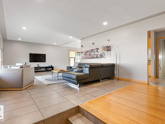 Modern and spacious, this 5 bedroom bungalow on a large corner lot offers incredible versatility with a second kitchen and stylish upgrades throughout. The main floor features bright living spaces, hardwood and tile flooring, and a modern kitchen with quartz countertops, stainless steel appliances, and contemporary glass backsplash. The dining area opens through patio doors to an enclosed breezeway—ideal as a 3-season patio. The large primary bedroom includes a private 3-piece ensuite, with two additional bedrooms and an updated bathroom with a soaker tub on the main floor. Custom built-in cabinetry provides ample storage. The finished basement boasts a large family room, full second kitchen, two more bedrooms, 3-piece bathroom, laundry, and additional storage. Outside, enjoy entertaining on the expansive 37’ deck with a built-in BBQ and fireplace. The fully landscaped yard includes mature trees, green space, and a greenhouse. Attached triple garage completes this rare offering.
