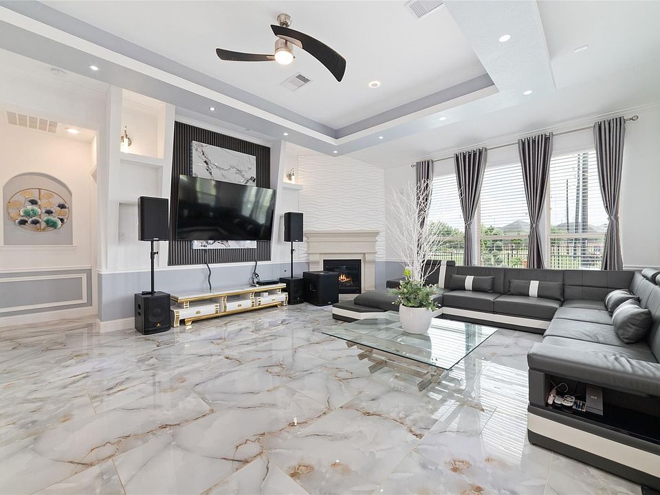 Gated communityHigh ceilingLake viewRecessed lightsOpen floor planBreathtaking lake viewLush greenery