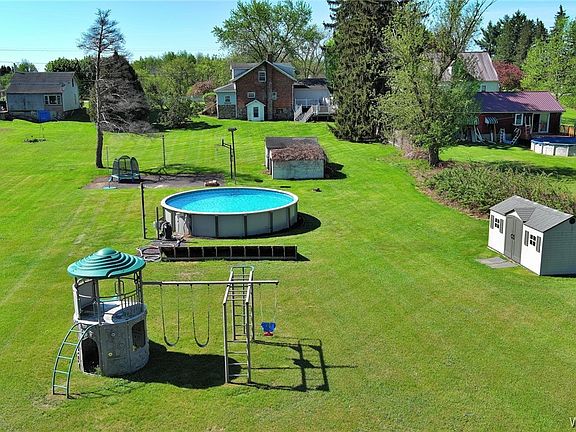Welcome home to this beautiful four bedroom 2 bath Brick and stucco home with attached two car garage on just under a 3 acre lot. Priced attractively, this home welcomes you with a covered front porch. Large kitchen with with eat in dining, open concept living room with formal dining area, gas fireplace, home media area and first floor laundry will make this home be the perfect setting family and friends to gather. Two full bathrooms with En suite in primary bedroom that features a jaccuzi style tub and plenty of room with three more bedrooms! Sliding glass door leads to spacious two tiered deck overlooking your beautiful yard that features a swimming pool, blacktop area is perfect for a basketball court and plenty of room to roam! Camping, swimming, four wheeling and gardening are all at your whim! Newer 150 amp electric service - Tesla charger included. New septic system in '22, Architectural roof, added Bilco doors for easy access to basement and plenty of outdoor storage make this a must have home.