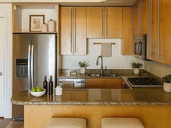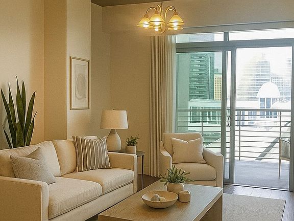Large city view balconyModern touchesTravertine tile finishesStainless steel appliancesWalk-in showerLovely wood built-insGranite counters